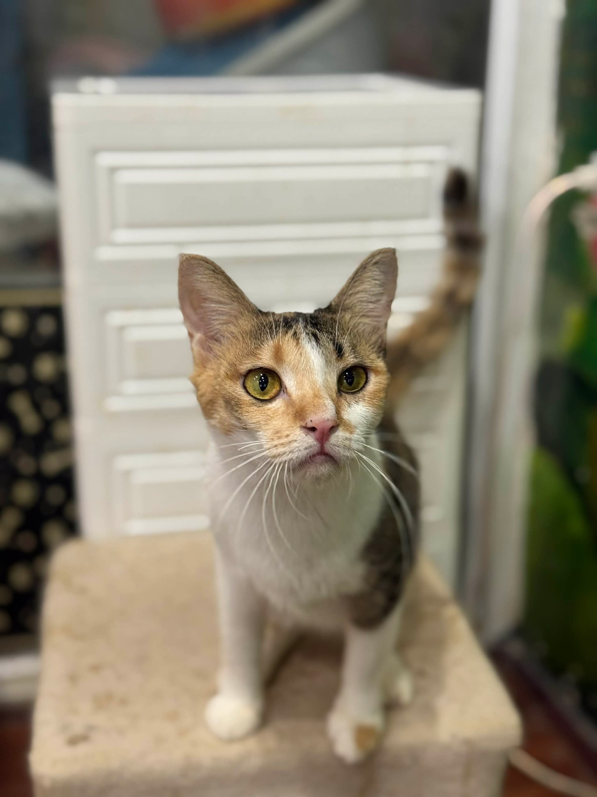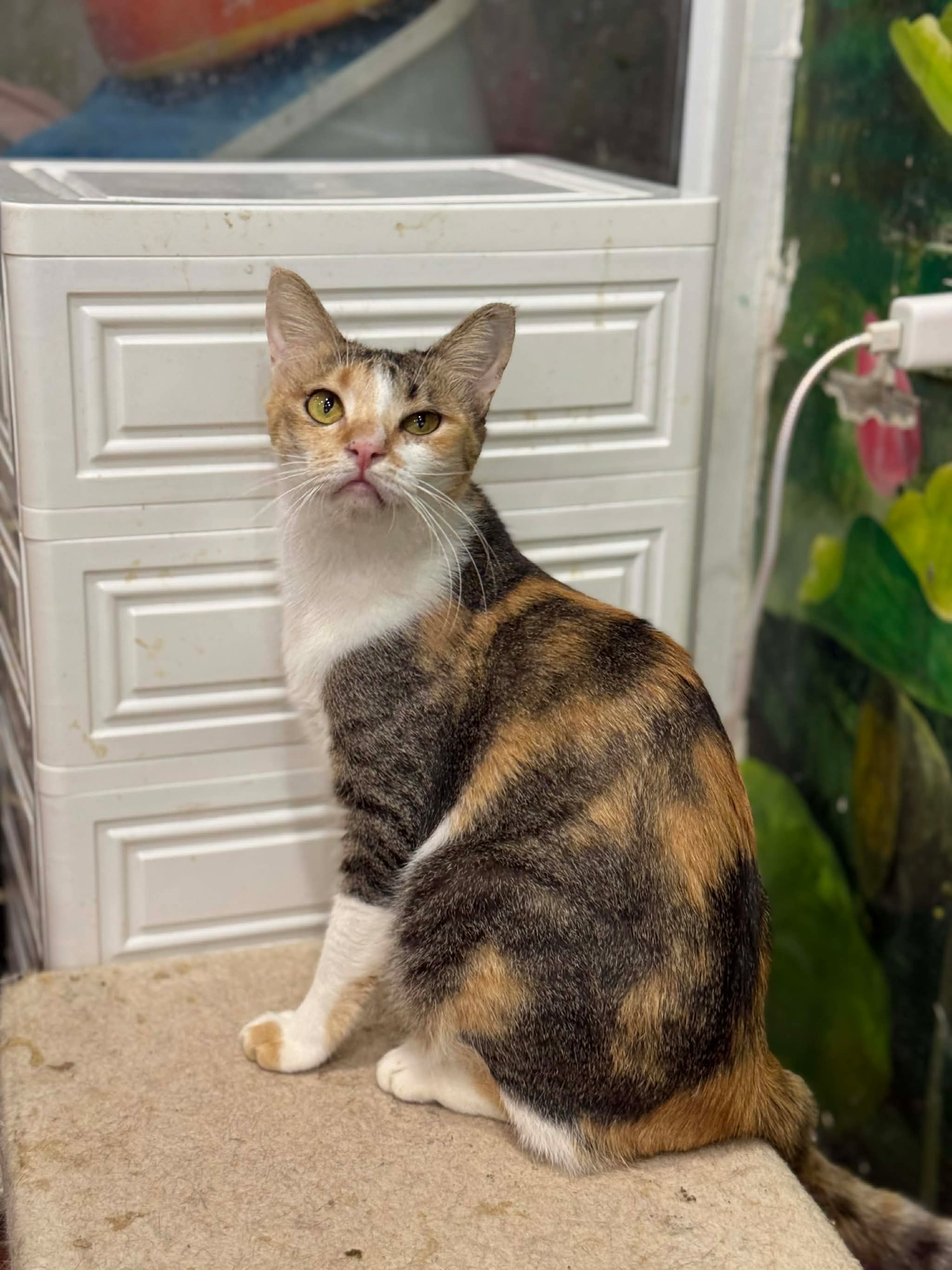 Mèo bị bỏ rơi, mắt nhiều ghèn mủ, gầy đói. Sau khi được chăm sóc hiện tại đã béo tròn ủng, rất quấn người và mèo. Chơi được với cún. Ăn được pate, ciao, thịt gà, hạt, pate