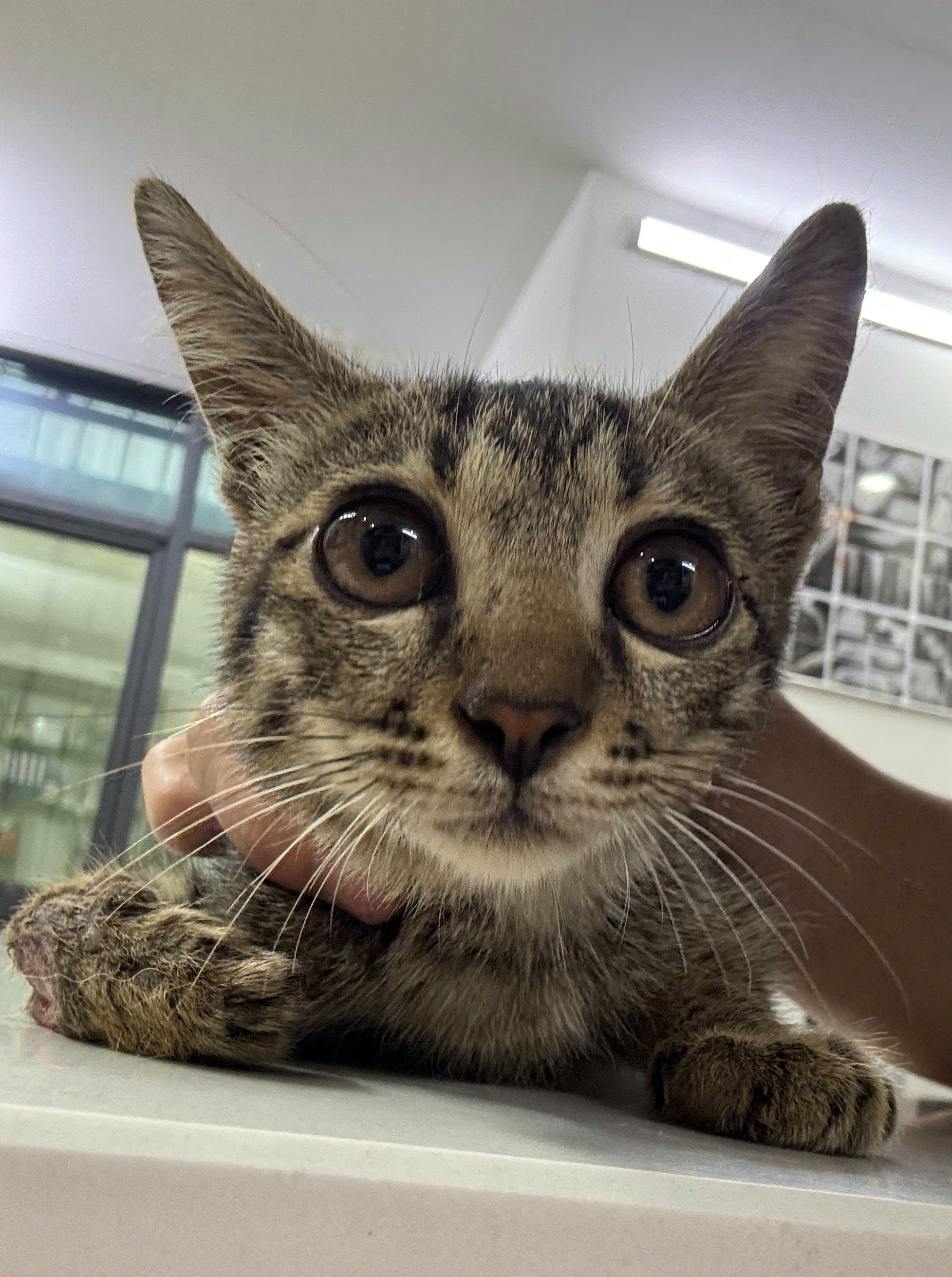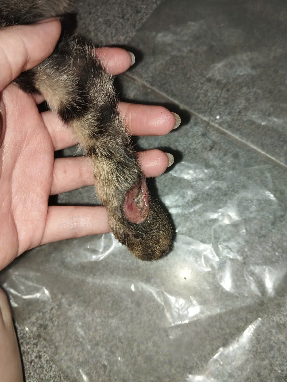 bạn mèo loét ở chân trái trước, chụp X quang chưa thấy tổn thương xương, trên người không thấy bọ chét