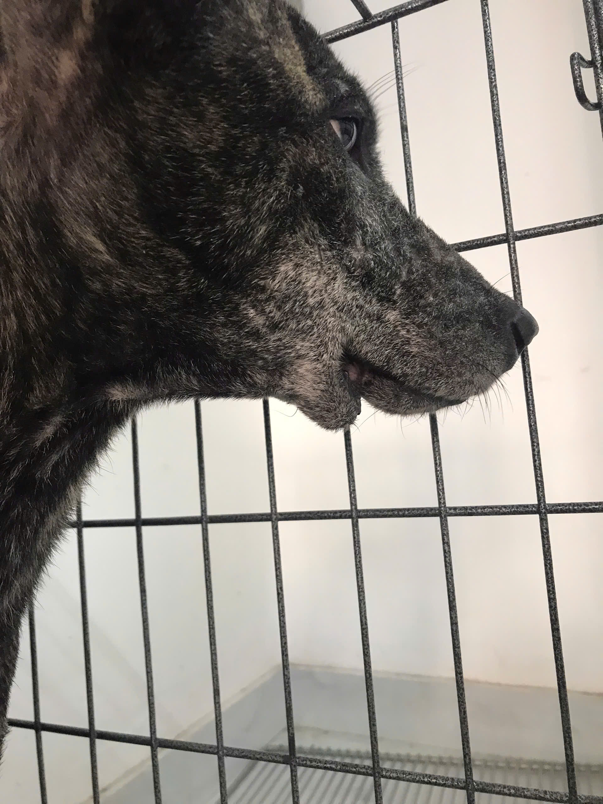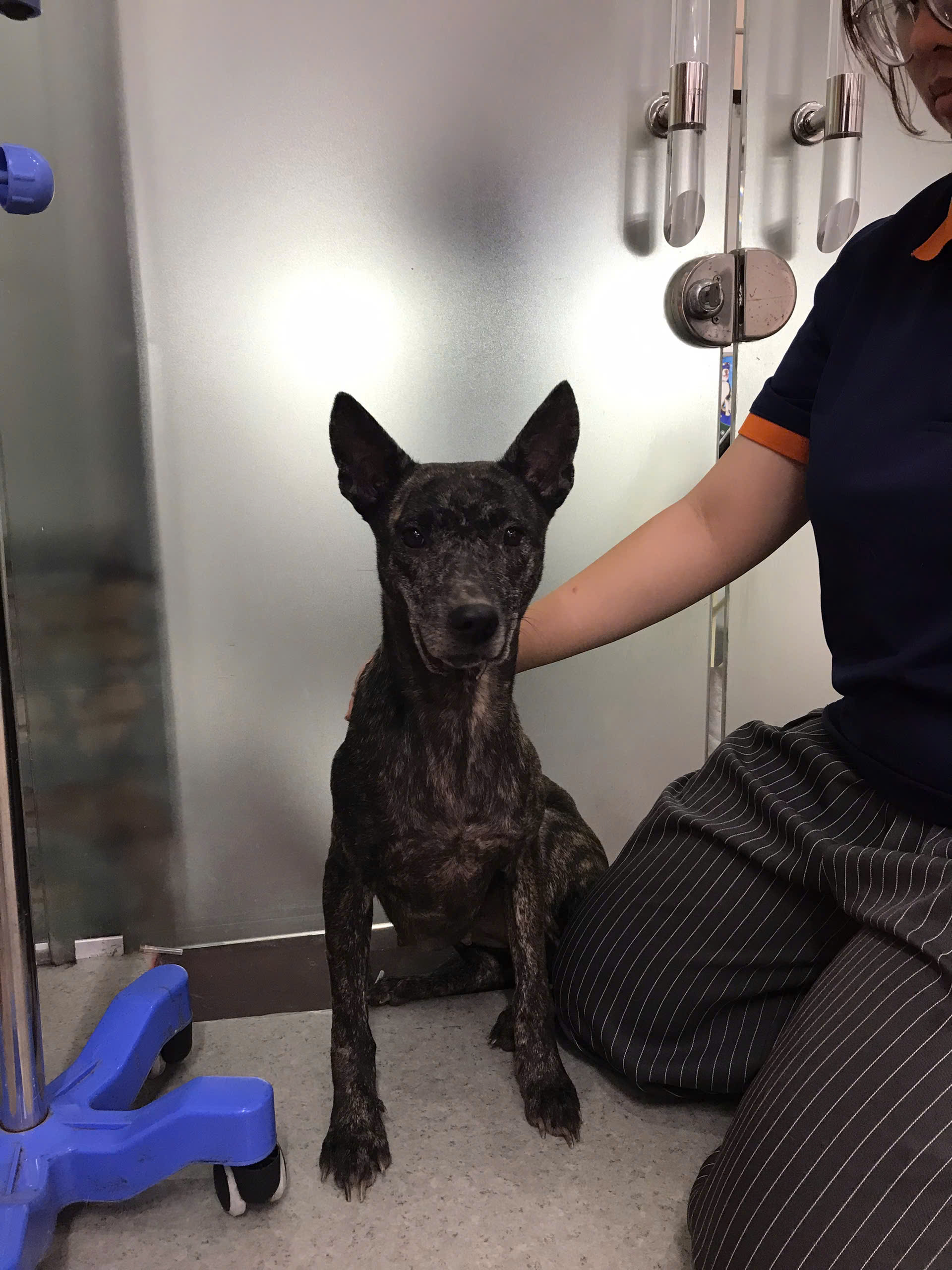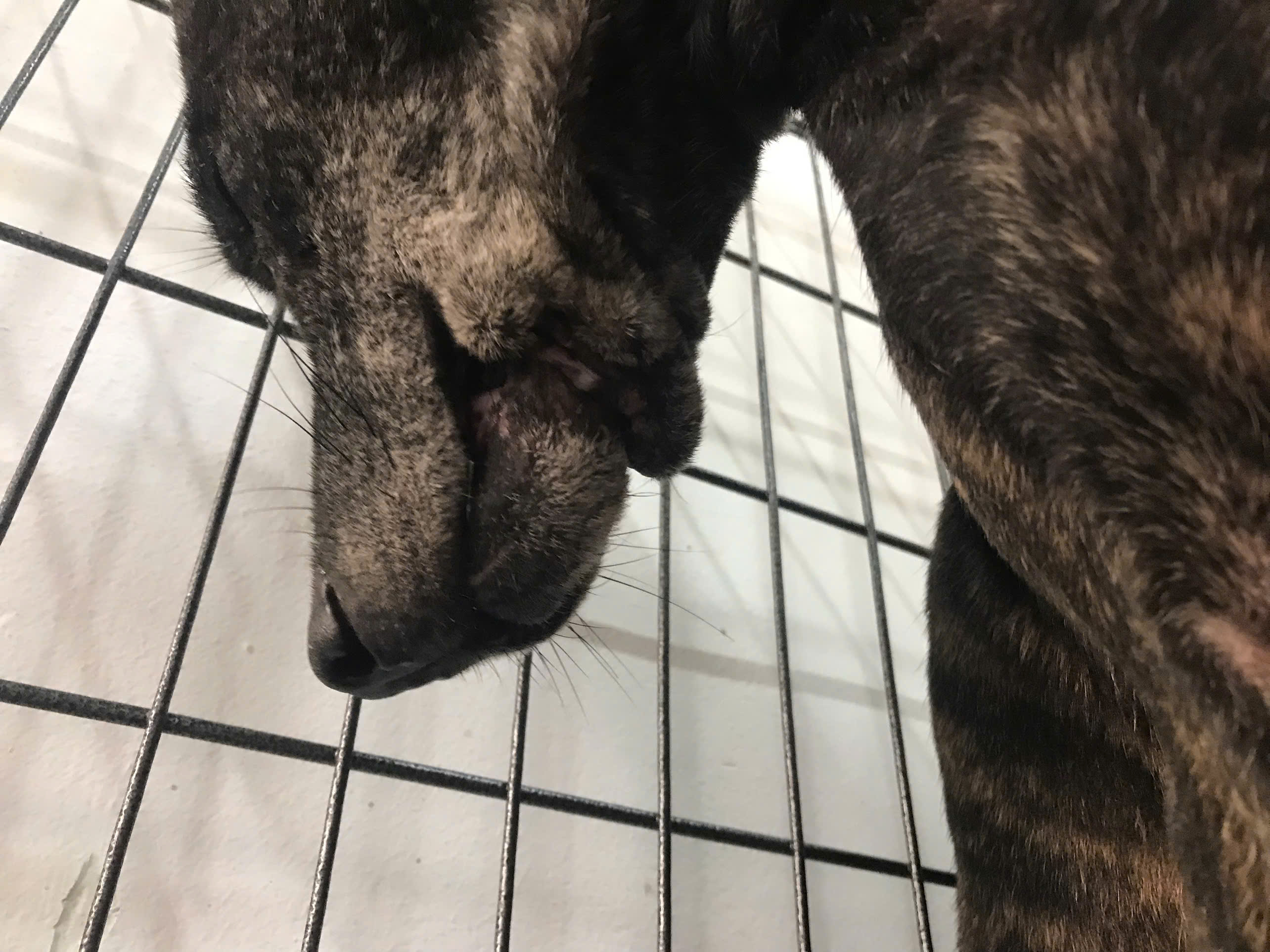 Bé bị chủ bạo hành buộc mõm để lại vết thương ở hàm dưới nhưng vẫn ăn uống bình thường. Thân thiện quấn người, đáng yêu