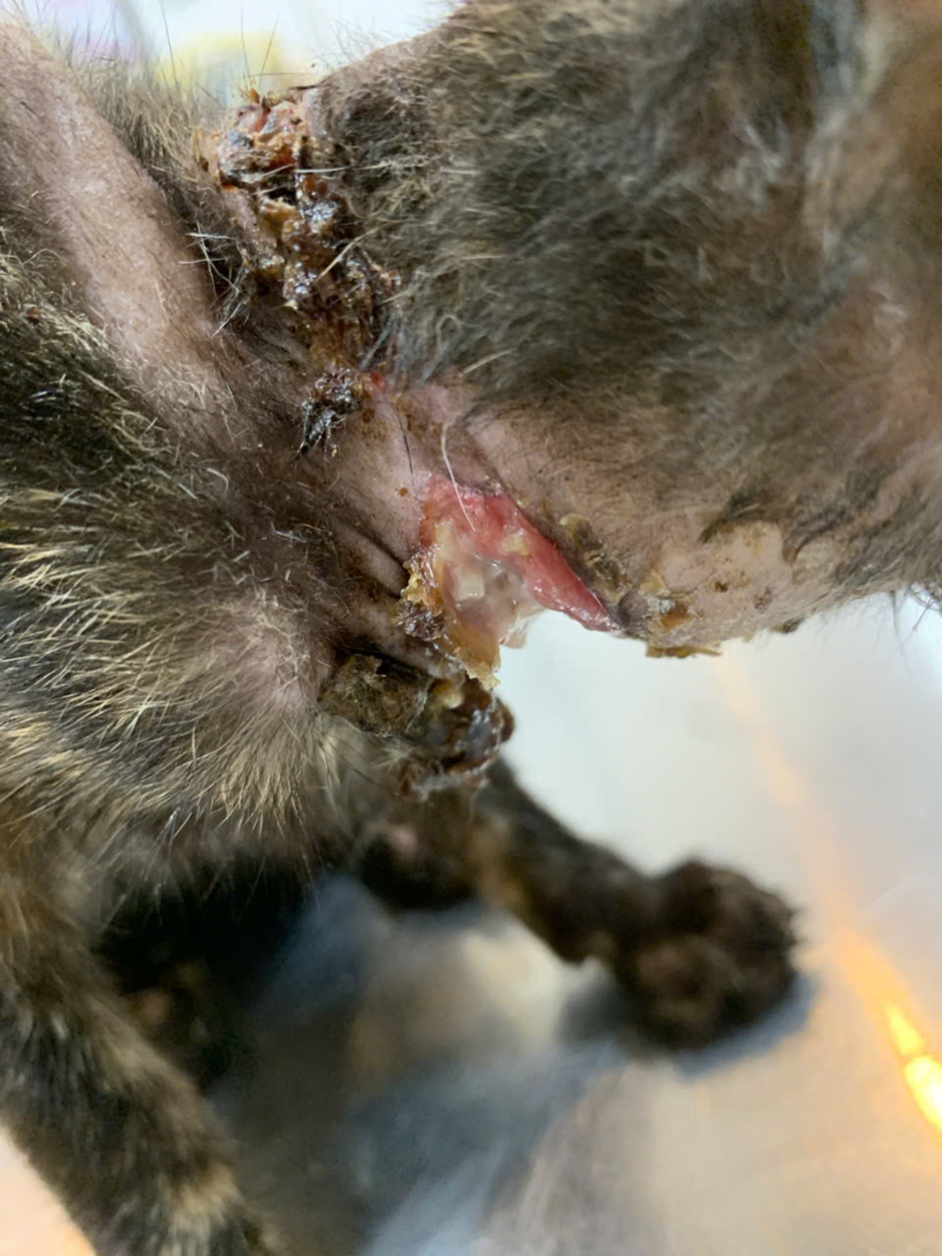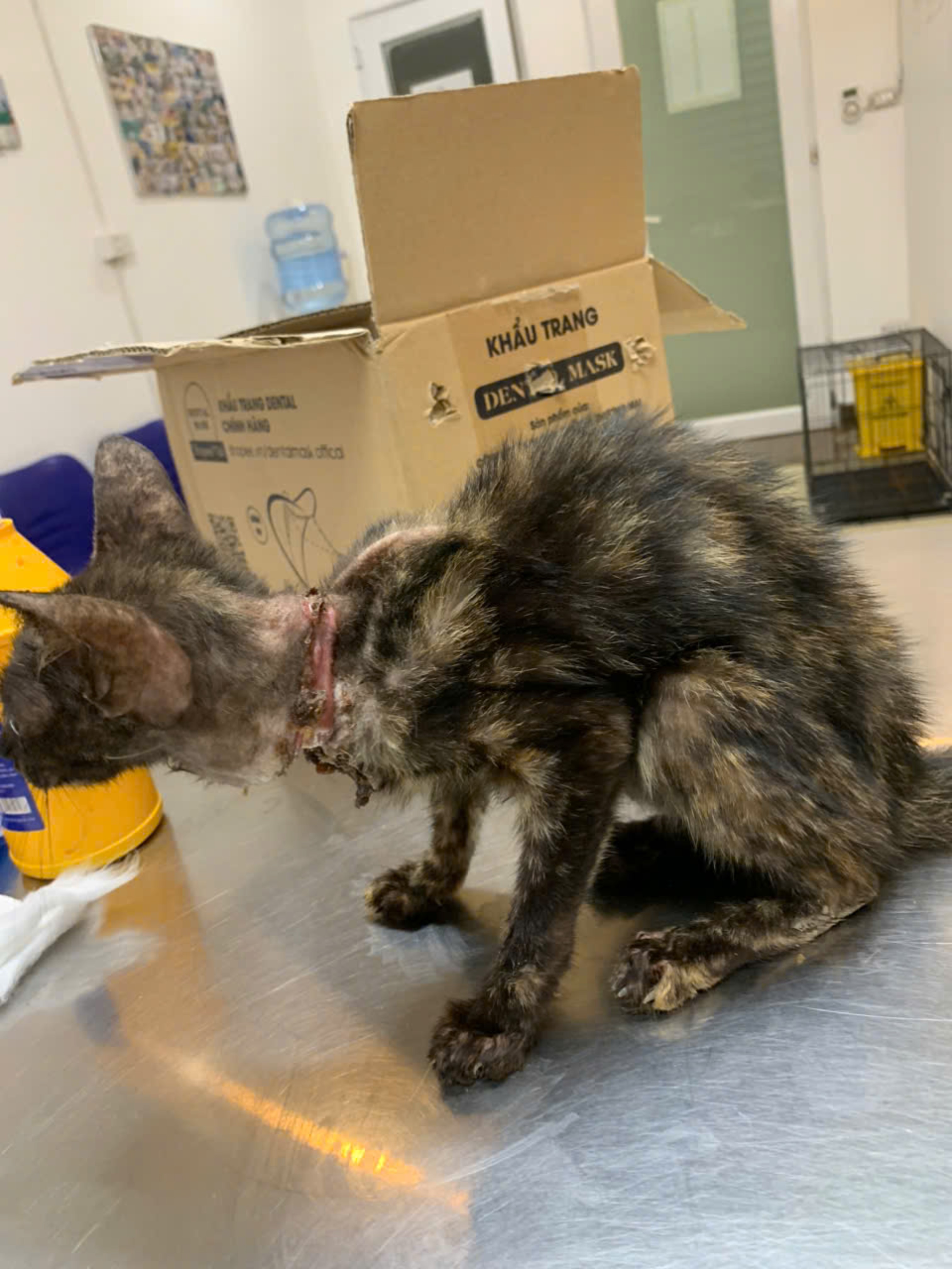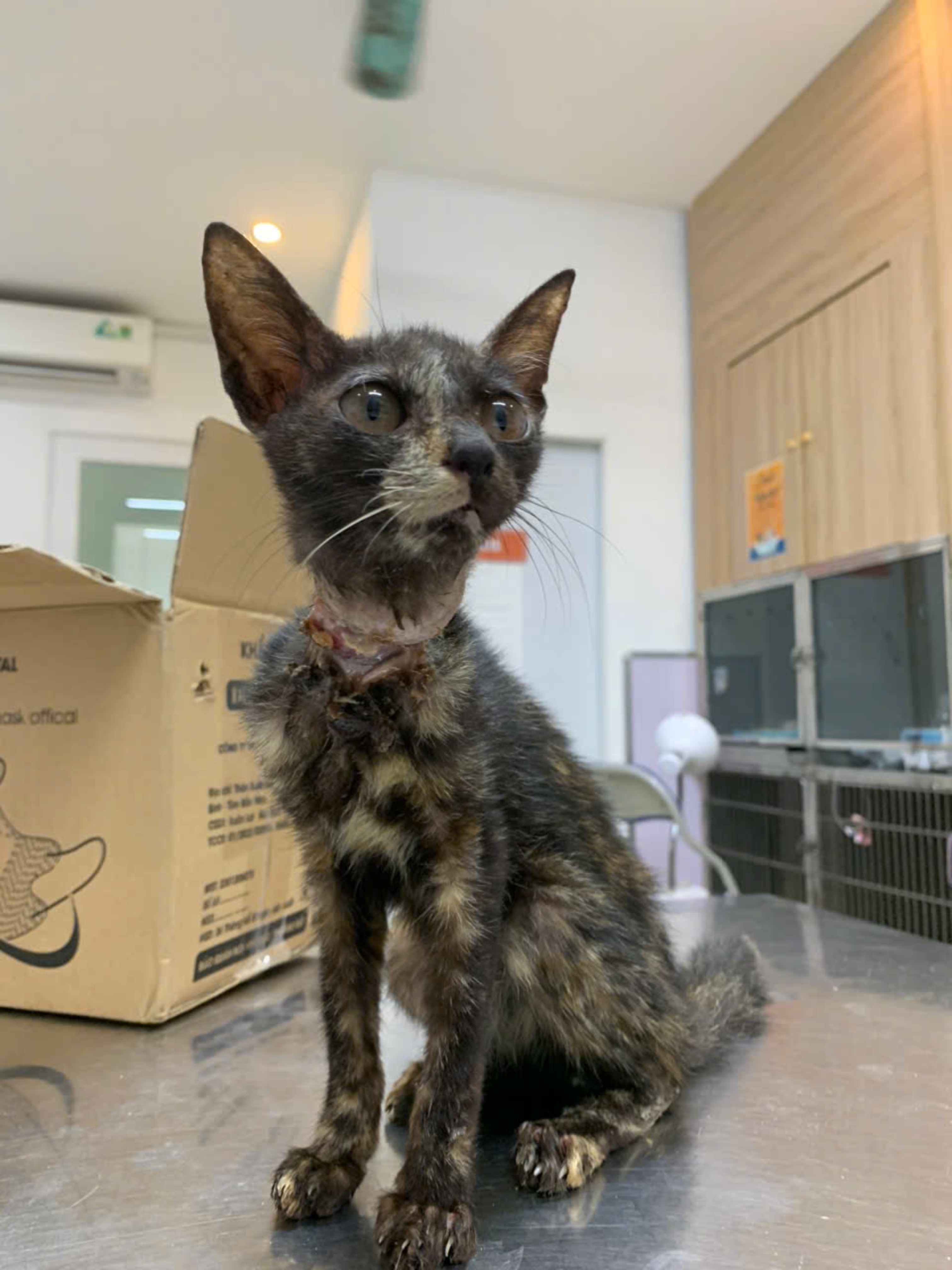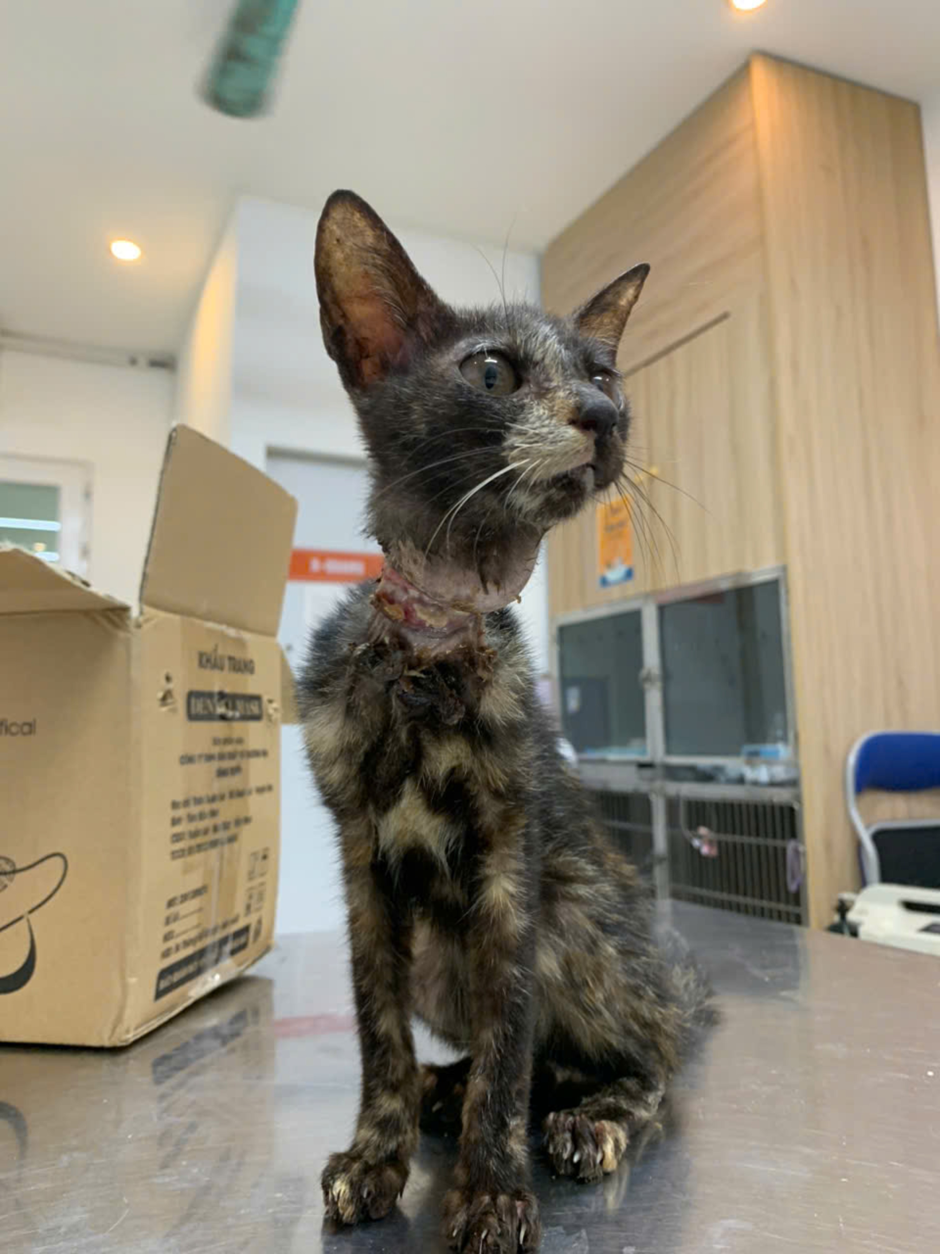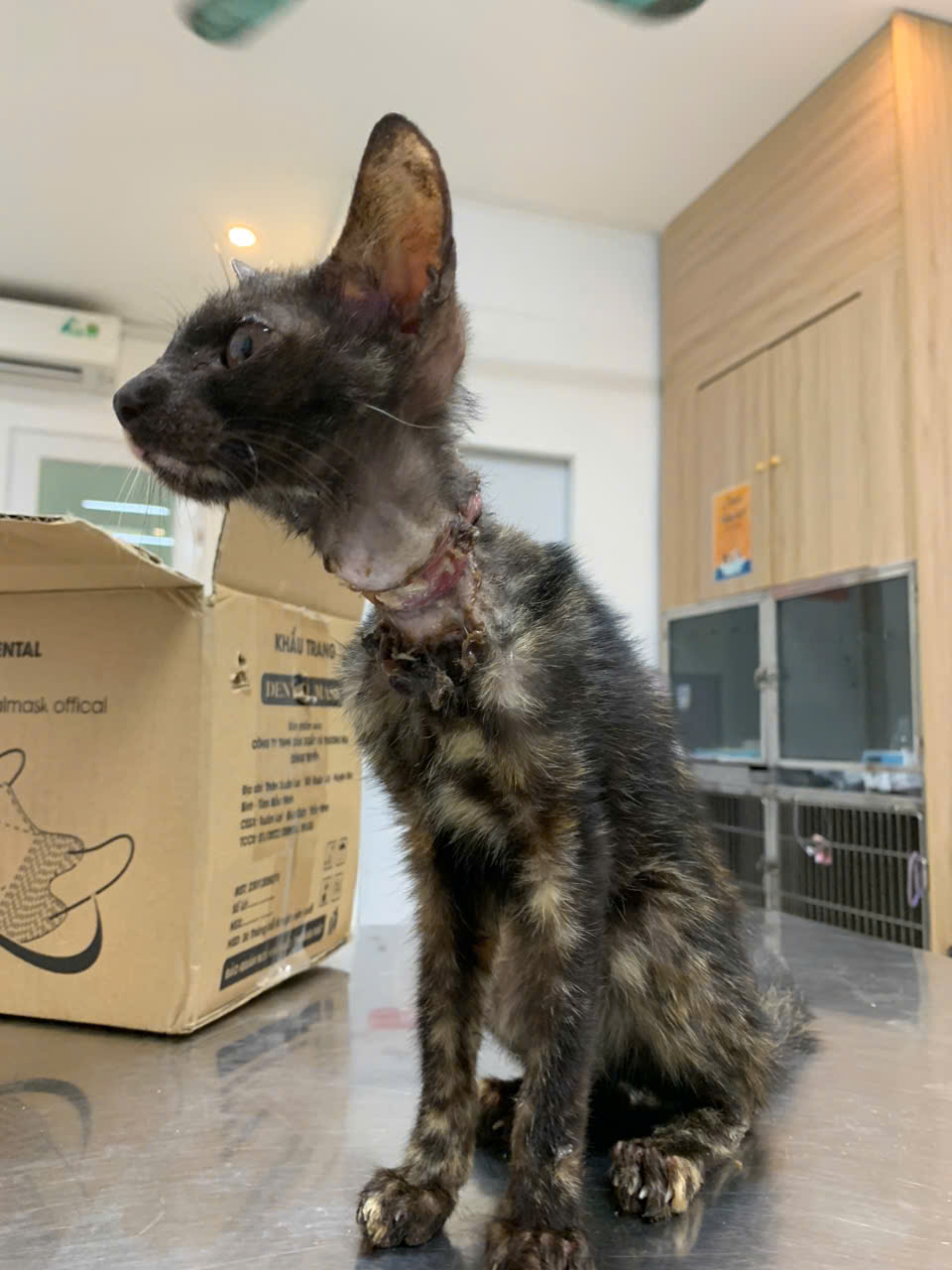 Bé bị dây siết cổ hoại tử, gầy, lang thang