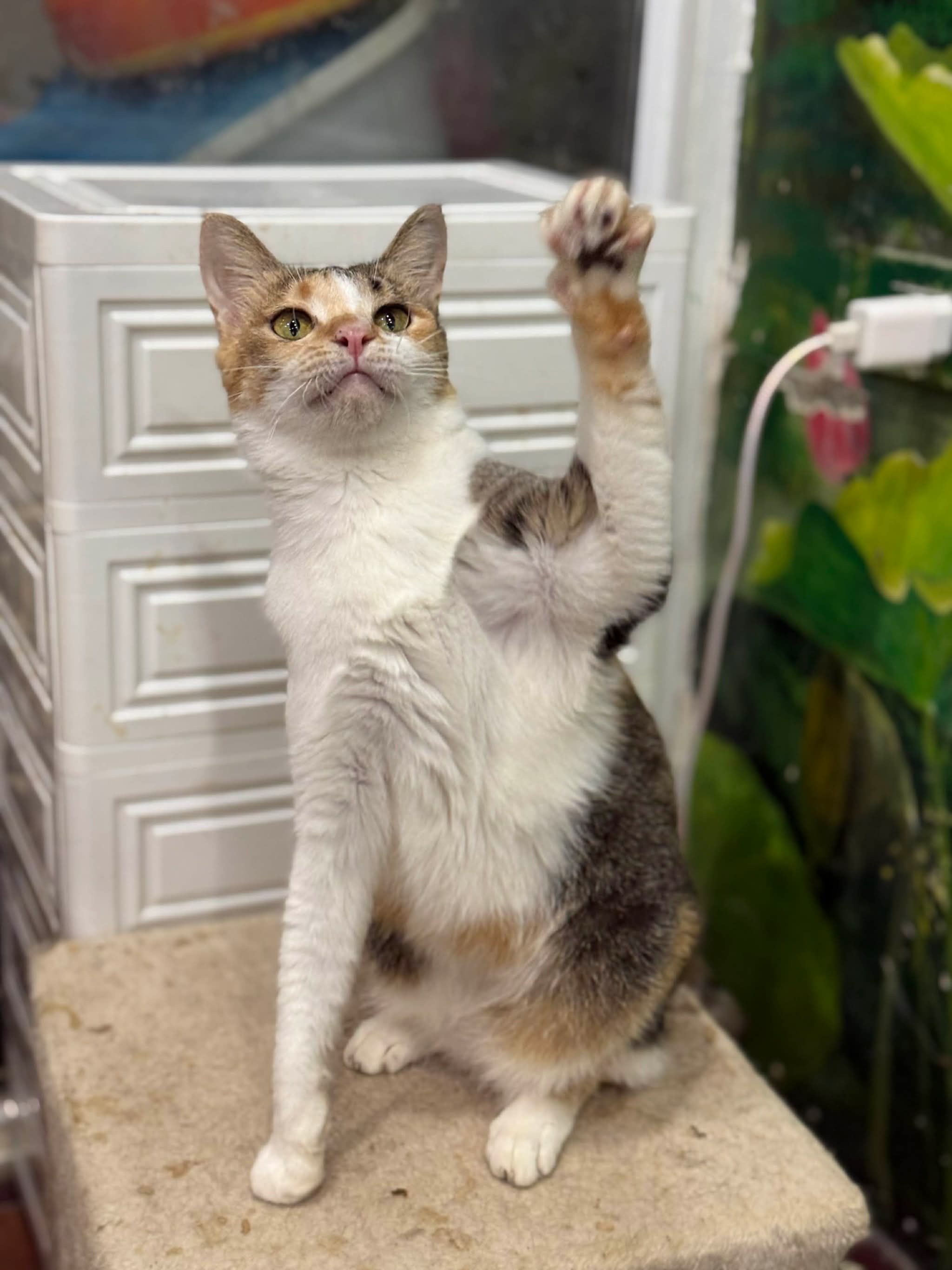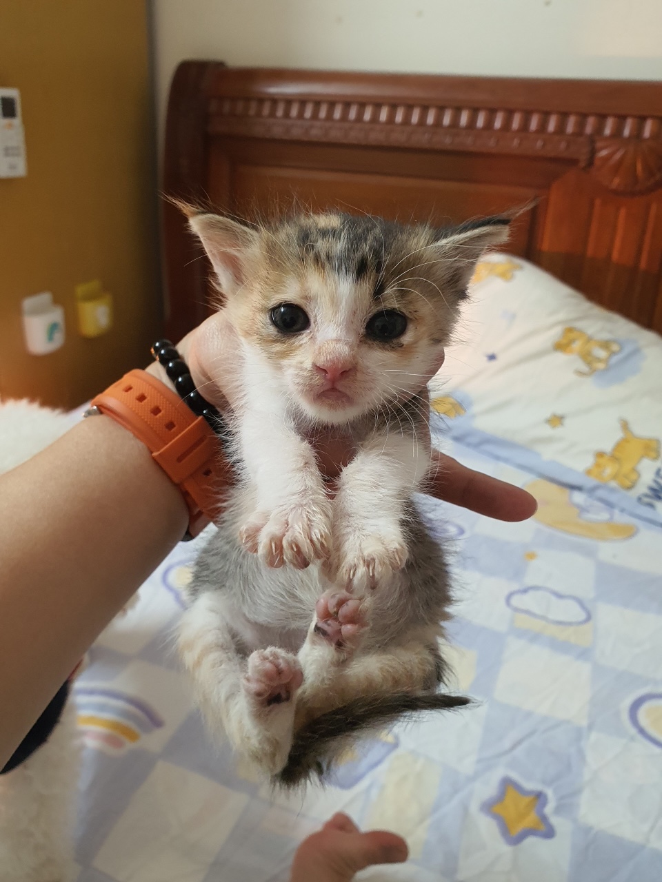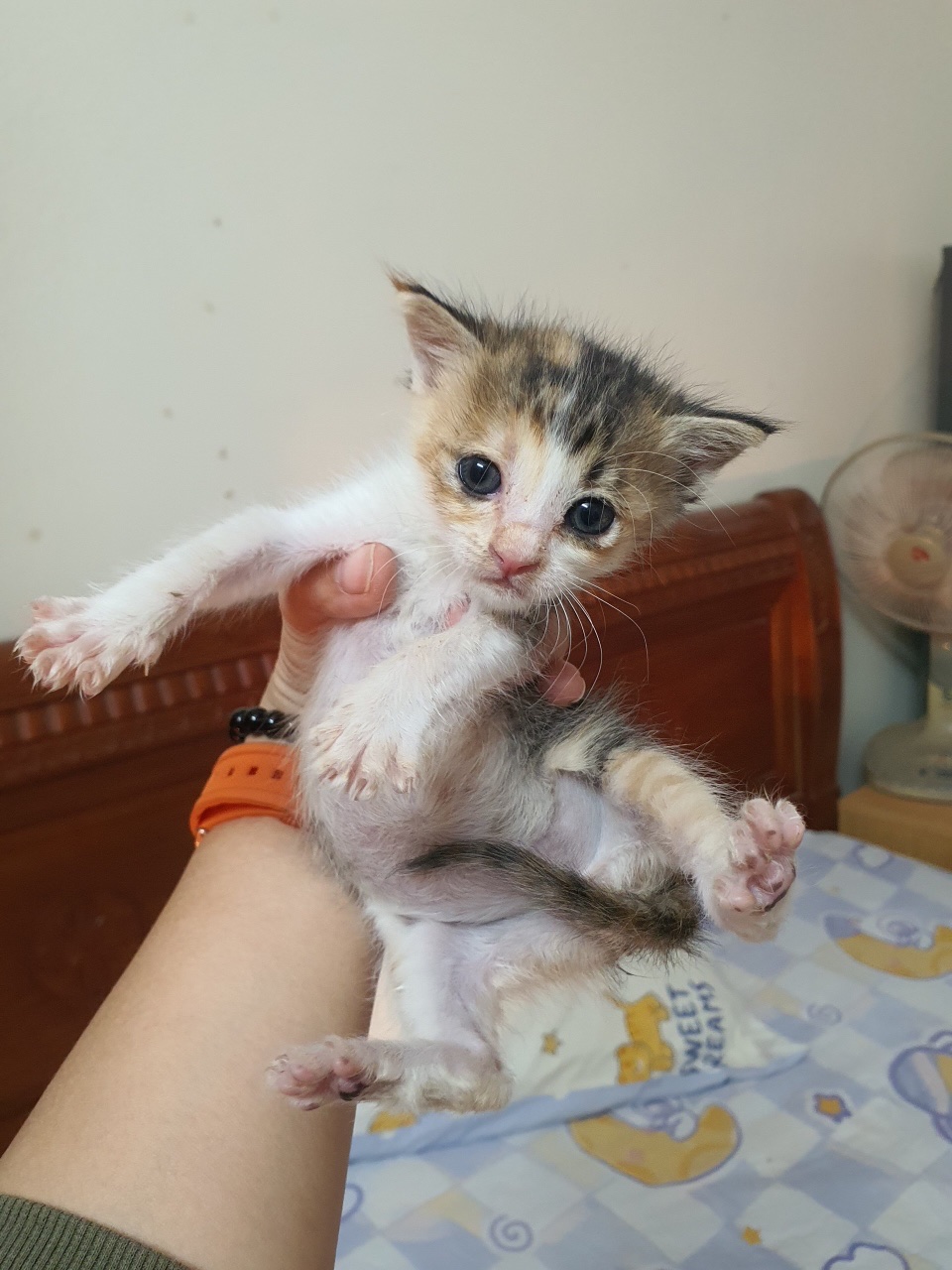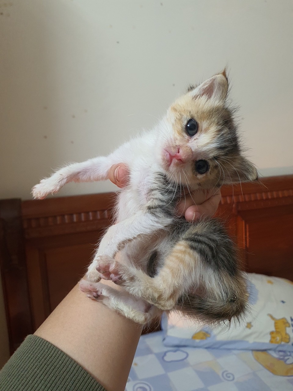 Mèo bị bỏ rơi, mắt nhiều ghèn mủ, gầy đói. Sau khi được chăm sóc hiện tại đã béo tròn ủng, rất quấn người và mèo. Chơi được với cún. Ăn được pate, ciao, thịt gà, hạt, pate
